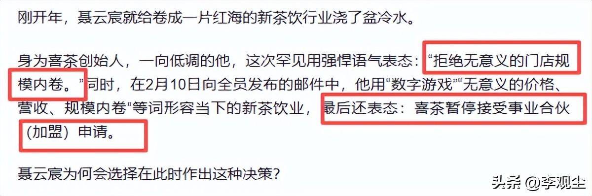 等新品牌也后来者居上,快速抢占市场份额。看着竞争对手们在规模上不断突破,资本市场也在催促着喜茶加速扩张,坚持了十年直营的聂云宸,终于在2022年底松口,开放了加盟。