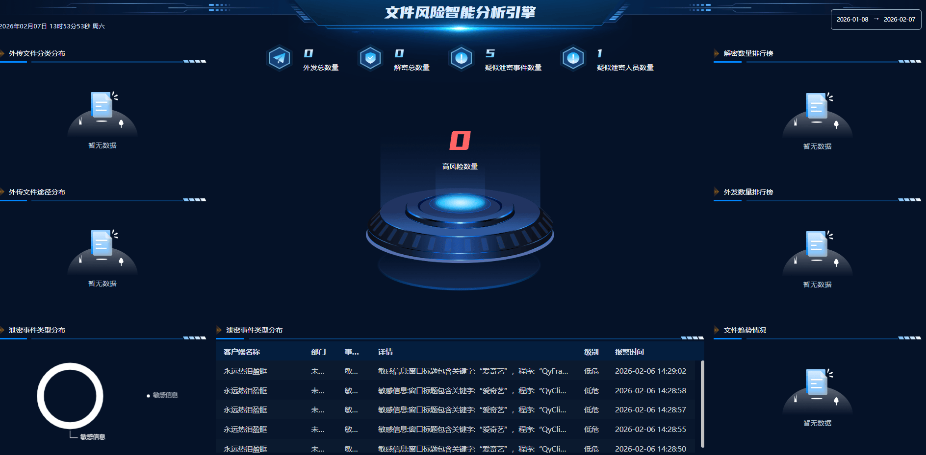 除工作行为分析外还可以进行文件风险智能分析,包括解密总数量,疑似泄密事件数量,疑似泄密人员数量等信息。