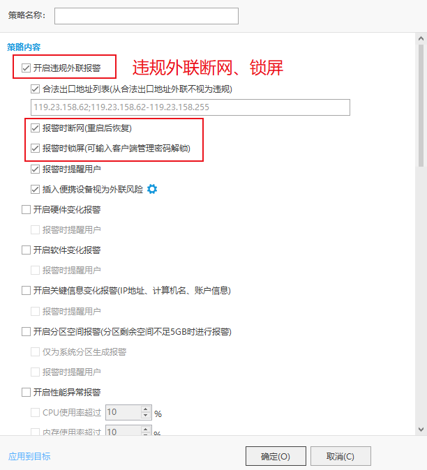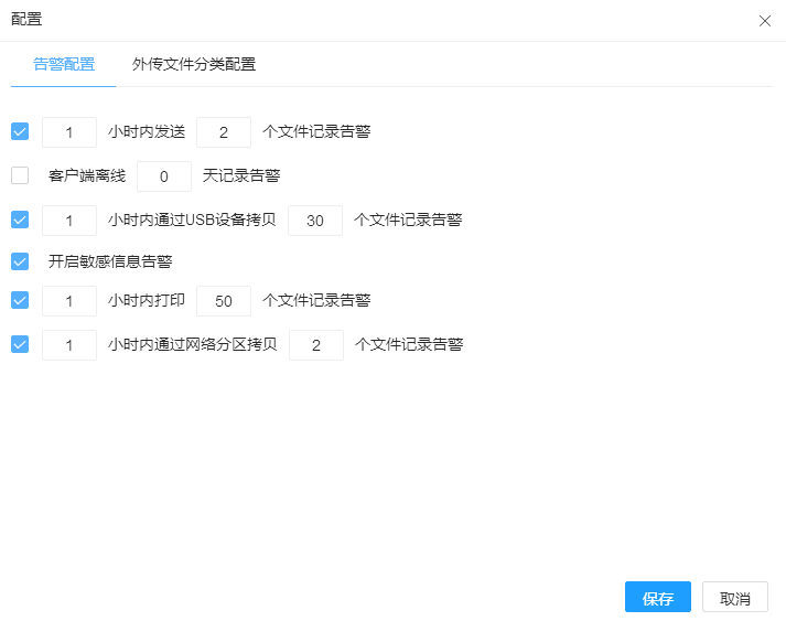 在文件告警配置中可以设置文件告警条件,包括文件外发、客户端离线、USB拷贝等,达到所设置的条件时会发出警告。