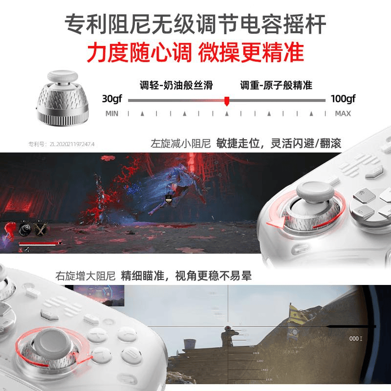 可调阻尼摇杆:根据用户偏好自由调整摇杆力度,实现精准控制,完美解决漂移和干扰问题,满足专业游戏需求。