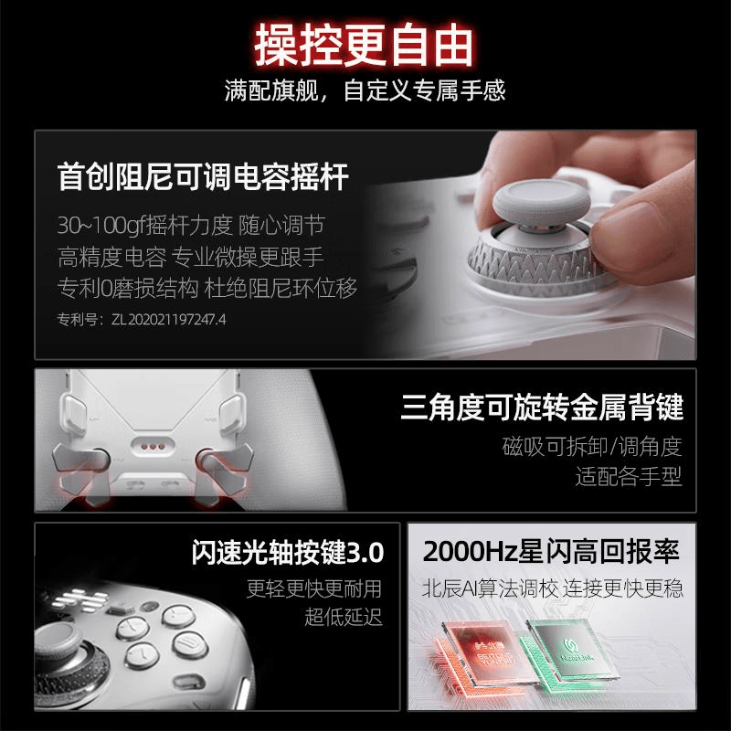 可调阻尼摇杆:具备三档阻尼调节,满足不同玩家的需求,确保在激烈对抗中仍能保持操控顺滑。